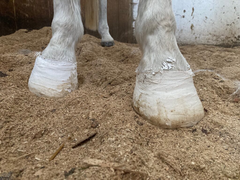 Nejvhodnější podestýlkou je hluboká vrstva jemných pilin nebo písku, která kopytům poskytne rovnoměrnou oporu a tlumí otřesy. Písek je výborný, protože se dobře „přizpůsobí“ tvaru kopyta, snižuje tlak a chladí. Hloubka podestýlky by měla být alespoň 20–30 cm, aby nohy měly měkký podklad. Samozřejmostí je udržovat podestýlku suchou a čistou. Kůň musí mít možnost si lehnout, aby odlehčil nohám. To je u bolestivého stavu zásadní.