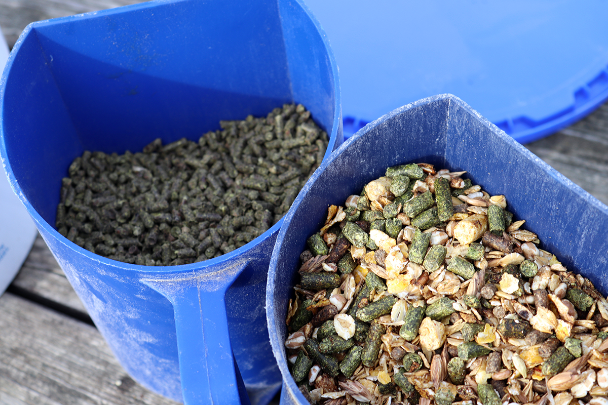 Namáčení sena po dobu alespoň 30 minut ve studené vodě fyzicky smyje část vodorozpustných cukrů a pomáhá tak snížit celkový obsah NSC v krmivu. Delší máčení, až 10 hodin, je efektivnější, co se týče vyplavení cukrů, ale jednak se zároveň s cukry vyluhují i potřebné mikro a makro prvky a hlavně při delším máčení se v seně velmi rychle začnou množit bakterie. V praxi je nejsnazší namočit seno v sítích do velkých kádí. Dobré je alespoň jednou vodu během namáčení vyměnit, seno před podáváním propláchnout a nechat vykapat. - Vlákninové müsli bez obilovin s nízkým obsahem škrobu