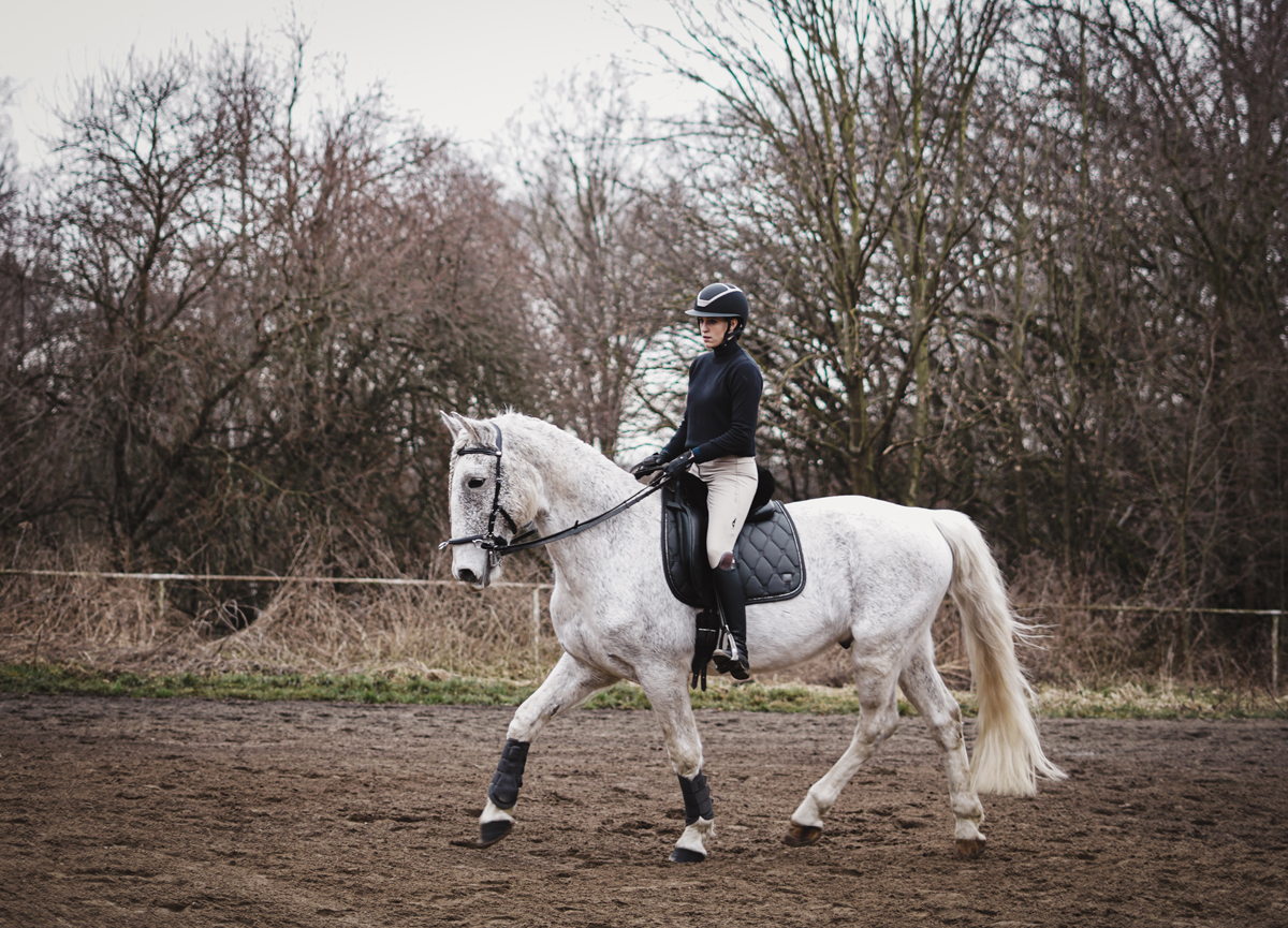 - Zapojení těla koně – Stabilní otěž umožňuje koni snadněji zapojit hřbet a podsadit záď, prodloužit krok a hledat rovnováhu.