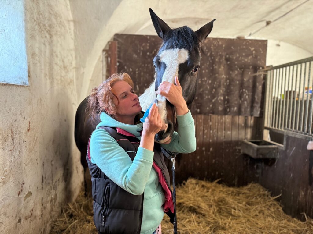 Tady se s majitelkou Soptíka (pozn. autora – ta dělala během aplikace pijavic rozhovor) můžeme trochu zasmát, protože on není úplně nadšený. Nicméně je to dané tím umístěním, kam se mu pijavice přikládají – na hlavu kolem očí, kde on má za sebou poměrně vážný úraz hlavy v hříběcím věku a s tím spojené dlouhotrvající problémy. Je na svou hlavu opravdu citlivý. Ale troufám si říct, že tak 90 % koní má hirudoterapii rádo a jsou s pijavicemi spokojeni, někteří podřimují, zívají. Je to dané tím, že v těle povolují různé bloky a spazmy nezávisle na tom, kam je pijavice přiložena. Takže většina koní je opravdu v klidu. Dokonce jsem aplikovala pijavice přímo na oční víčko nebo na dáseň po trhání zubů a klisna držela jako beránek.