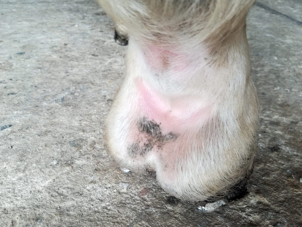 - Po odstranění stroupků nebo v případě, že podlom mokvá, je krvavý či jsou vidět praskliny kůže, je nutné opláchnout postižené místo dezinfekčním roztokem. Vhodná je naředěná Betadina či jiný přípravek na bázi jódu, ten je účinný proti mnoha patogenům a v ředěném stavu nepoškozuje kůži. Možné je použít i roztok chlorhexidinu nebo velmi slaboučký roztok hypermanganu. Toto ošetření je vhodné provádět i několik dní, dokud se objevuje mokvání. Dezinfekční roztoky zneškodní případné patogeny v ráně, zároveň nepoškodí kůži, ani „nezavřou“ ránu, jako například pudry, masti, pasty a podobně. Po dezinfekci mohou pomoct i odvary z některých léčivých rostlin, například heřmánku, měsíčku, řepíku nebo jitrocele. Pomáhají vysušit mokvavou ránu a také tlumí zánět.