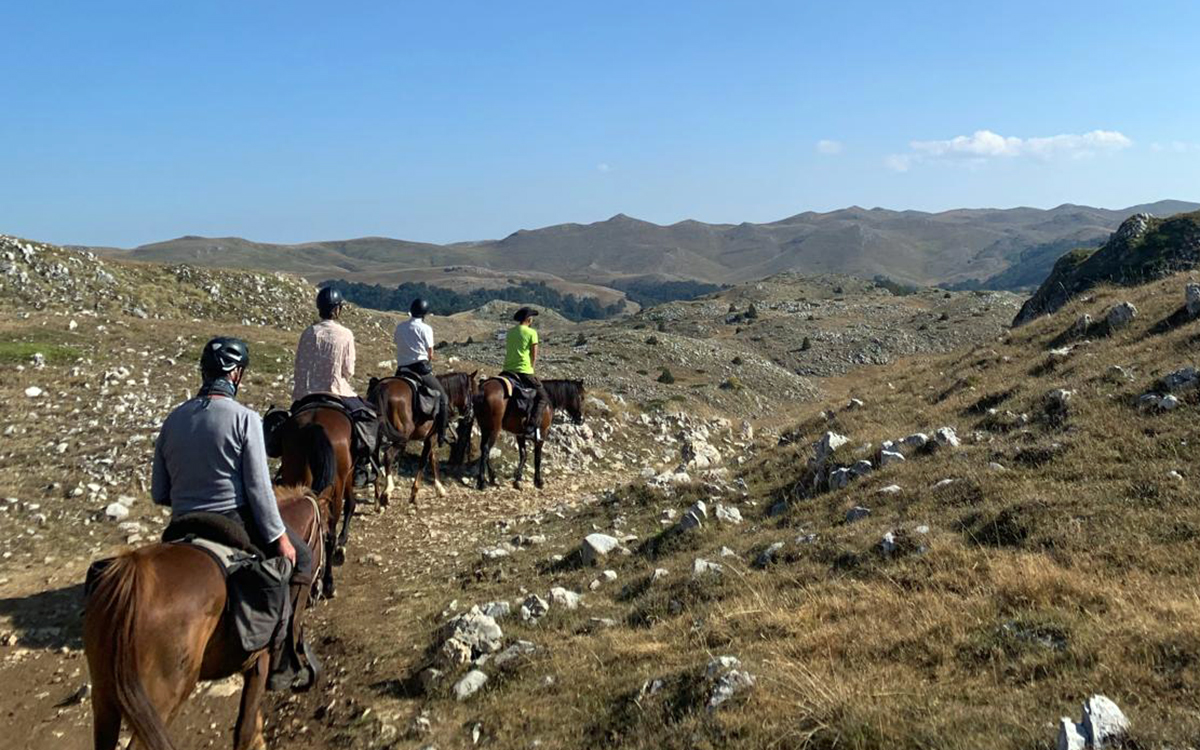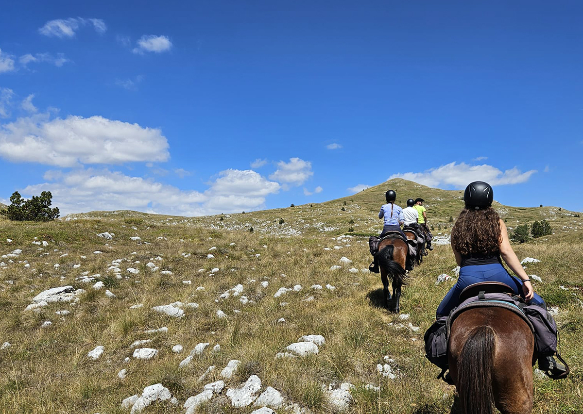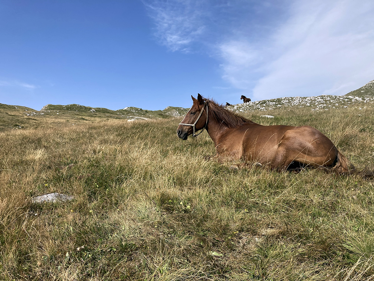 Brzy ráno sedláme koně a vyrážíme. Čeká nás dlouhá etapa – přechod přes náhorní plošinu – planinu. Je to krajina surová, ale fascinující. Vegetace je řídká, stromy a keře tu téměř nejsou, tráva je nízká, spálená sluncem, vítr fouká bez ustání. Bílé vápencové skály jsou ostře řezané. Všechna voda se rychle vsákne, a tak je tu o ni nouze. Jedeme po úzkých, vyšlapaných pěšinách, které znají jen místní – a jejich dobytek a koně. Někdy jsou širší, jindy se úplně ztrácí v kamenitém svahu. Tady jdeme jen a jen krokem. Krajina jakoby vypadla z filmů o Vinnetouovi, a tak za každým horizontem či zatáčkou vyhlížím Hatátilá a Ilčí. Vlastně mě ani nepřekvapí, když se najednou před námi objevuje stádo divokých koní. No nejsou divocí, jen jsou volně. Hřívy jim povlávají ve větru. Ten okamžik je tak silný, že se nám všem na chvíli zastaví dech.
