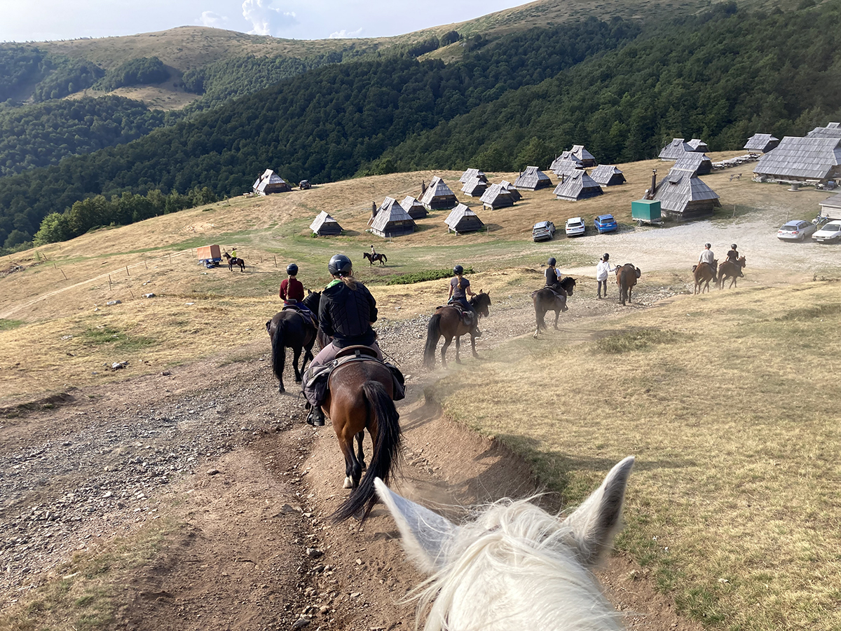 Najednou slunce mizí za tmavým bouřkovým mrakem a zvedá se vítr. Rychle nasedáme a spěcháme z vrcholu dolů – kdyby přišly blesky, nechceme být snadným cílem. Cesta vede po úbočí hory, jedeme loukou, borůvčím i klečí. Po necelé půlhodině se před námi objevuje katuň – tradiční černohorská salaš. Koně přivazujeme ke stromům, dostávají pořádnou porci ovsa a zasloužený odpočinek. Když jsou koníci obsloužení, přicházíme na řadu my.