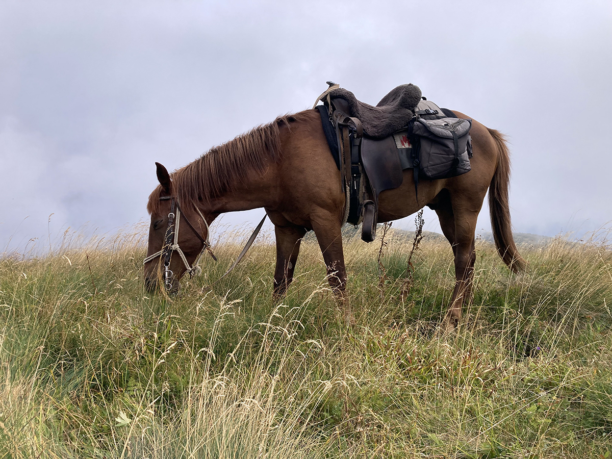 Ráno nás probouzí déšť. Hory, které v noci osvětlovaly zářící hvězdy, jsou teď zahalené do husté mlhy a těžkých mraků. Koně dostávají snídani, my se také nasytíme a čekáme, až se počasí umoudří. Nakonec se mraky roztrhají a my vyrážíme. Dnešní trasa vede po travnatých úbočích s výhledy do hlubokých údolí. Krajina je jiná, méně dramatická, ale stále krásná. Po pár hodinách jízdy se počasí výrazně zlepší. Slunce si razí cestu mezi mraky a my překračujeme další hřeben, za nímž se nachází naše další zastávka – katuň Goleš, další domov na jednu noc.