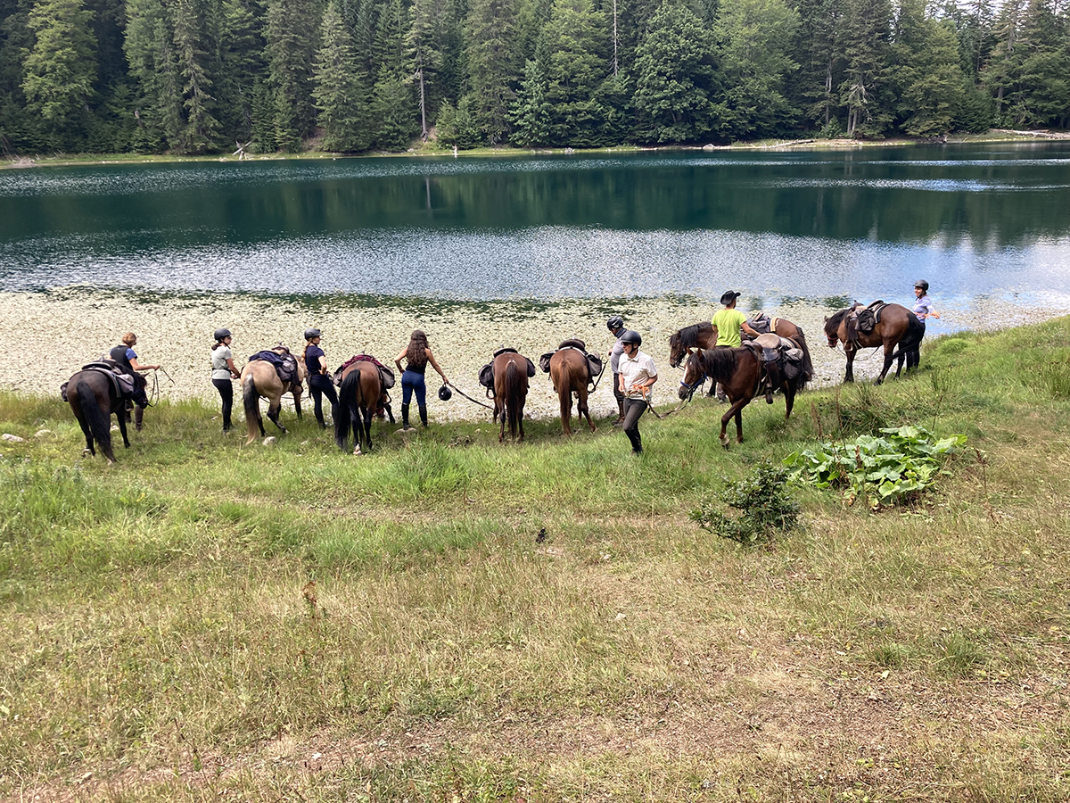 Planiny jsou za námi a klesáme do smrkového lesa. Stromy tu jsou vysoké, tmavě zelené, a zem je pod nimi měkká kvůli spadanému jehličí. Vzduch je svěží a chladný, trochu vlhký, s vůní pryskyřice. V lesích se schovává jedno z 19 ledovcových jezer Durmitoru. Zastavujeme se u něj, koně dostávají zasloužený odpočinek a oběd. I my po šesti hodinách v sedle odpočíváme. Osvěžení v jezeru je báječné! Voda znovu dodá sílu a energii. Tu budeme potřebovat, ke katuni je to ještě přes dvě hodiny jízdy po loukách, kde si užíváme cvalu.